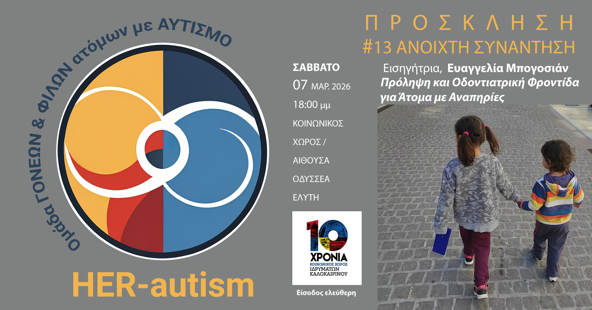 13η Ανοιχτή Συνάντηση της HER-autismΗ Πρόληψη είναι Δικαίωμα. Η Φροντίδα είναι ΣεβασμόςΣάββατο 7 Μαρτίου 2026 | Ώρα έναρξης 18:00Κοινωνικός Χώρος των Ιδρυμάτων Καλοκαιρινού Παραμονή της Ημέρας της Γυναίκας, συζητάμε για κάτι βαθιά ανθρώπινο: την ποιότητα ζωής, την υγεία και την ισότιμη πρόσβαση των ΑμεΑ στην οδοντιατρική φροντίδα. Σε μια εποχή που η φροντίδα, η κατανόηση…